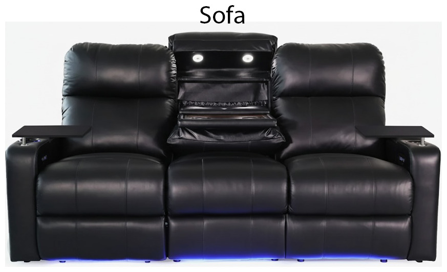 Sofa har en ej fällbar plats i mitten och saknar armstöd mellan platserna. Det går istället att föll ner mittplatsen till ett bord. Ytterplatserna har elfällning.
